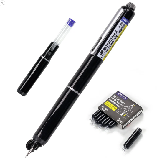 Fountain Pen Retractable Black +5 Black Ink Cartridges