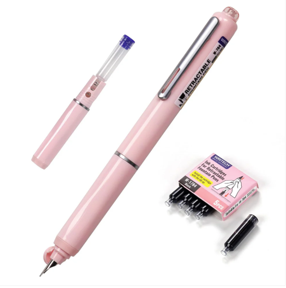 Fountain Pen Retractable Pink +5 Black Ink Cartridges